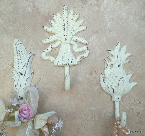 Set of three (3).Cast Iron Fall Harvest Wall HooksLarge Harvest themed hook. Each with a different face. One hook on the bottom. Crafted out of cast iron in a Shabby distressed off white. Perfect in any room. Use it inside or out. Sturdy and practical.Corn Measures 2" wide x 8" high x 1 1/2" off the wall. Wheat Measures 4 1/2" wide x 8" high x 1 1/2" off the wall. Pineapple Measures 3 1/2" wide x 8" high x 1 1/2" off the wall.